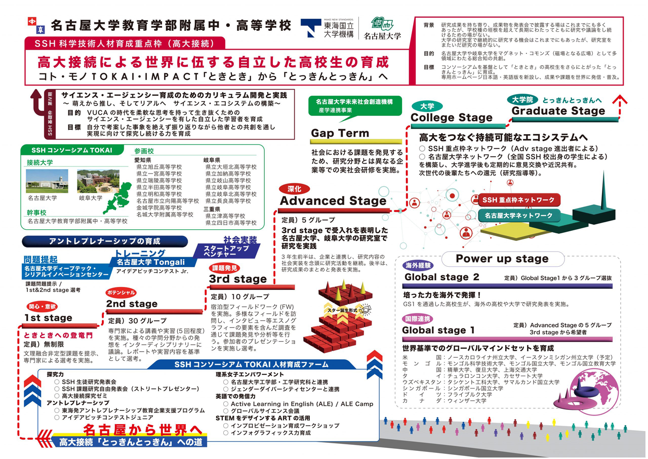 「SSH 科学人材育成重点枠(高大接続)」に採択(指定期間:令和6年度~令和10年度)された本学教育学部附属中・高等学校では、東海地区の高校で構成されたSSH コンソーシアムTOKAI(SSCT)の生徒たちが、名古屋大学や岐阜大学と連携した「競争と協同」のステージを経て、『ときときの高校生』として成長し、大学、大学院と一気通貫で『とっきんとっきん』のサイエンティストとして成熟していく、次世代のサイエンスロールモデル育成を目的とした事業が実施されています。